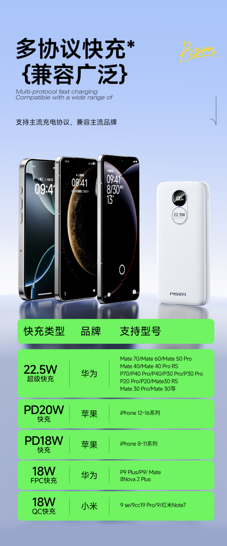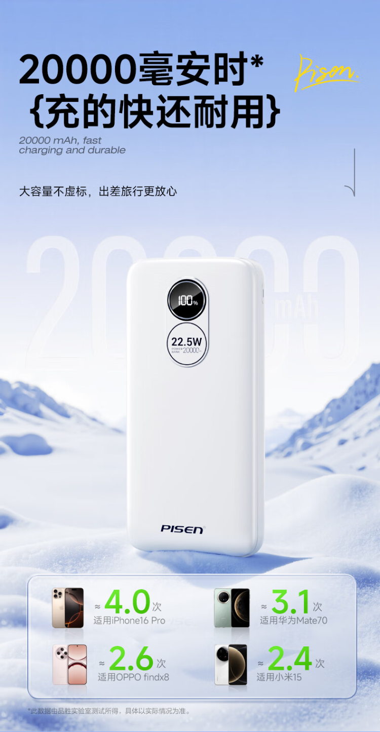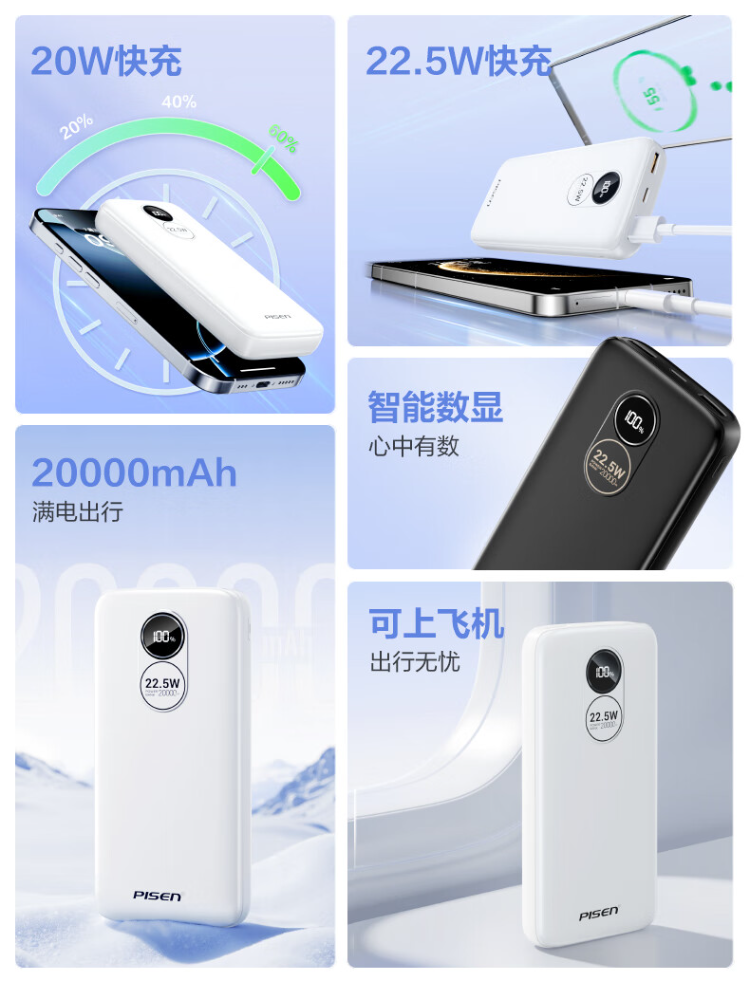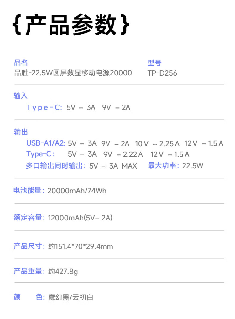 TP-D256黑 品胜 22.5W超级快充20000mAh大容量充电宝PD20W可上飞机