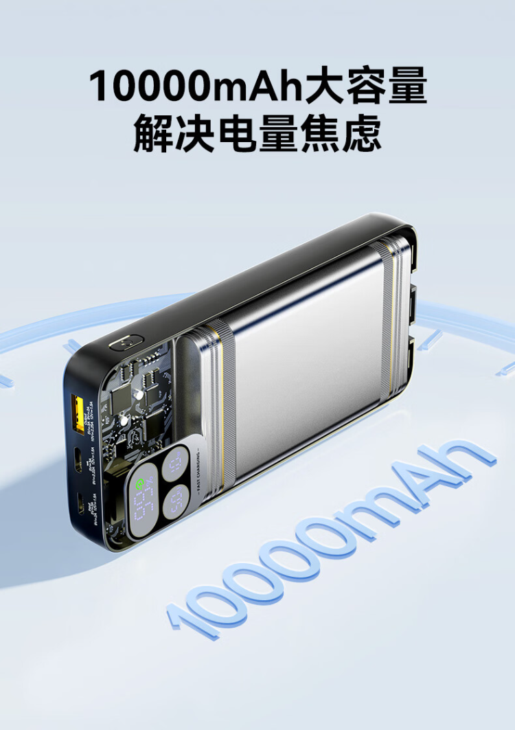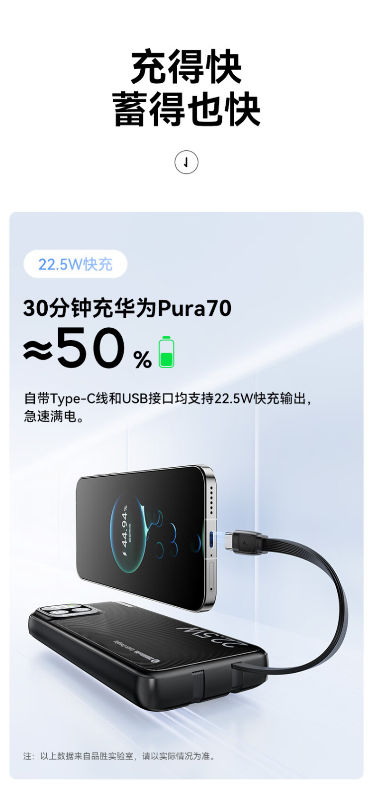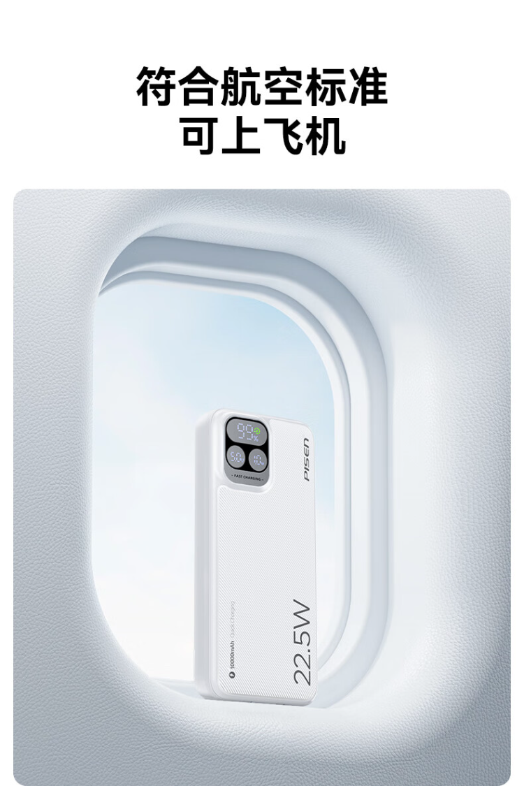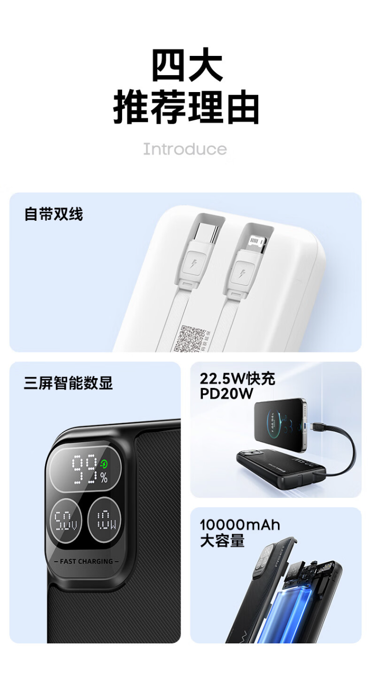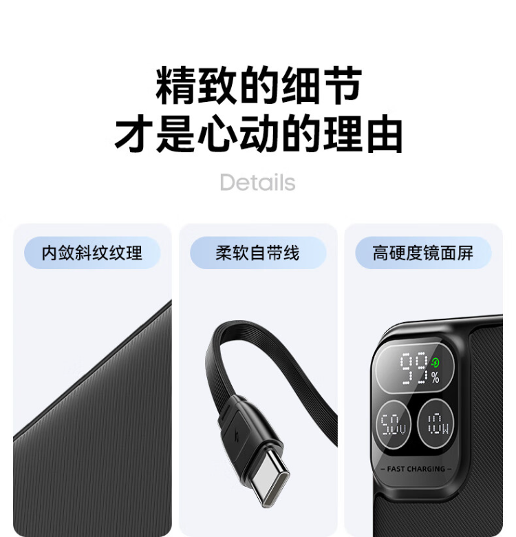 TP-D31黑 品胜充电宝自带线10000毫安大容量22.5W超级快充轻薄便携移动电源