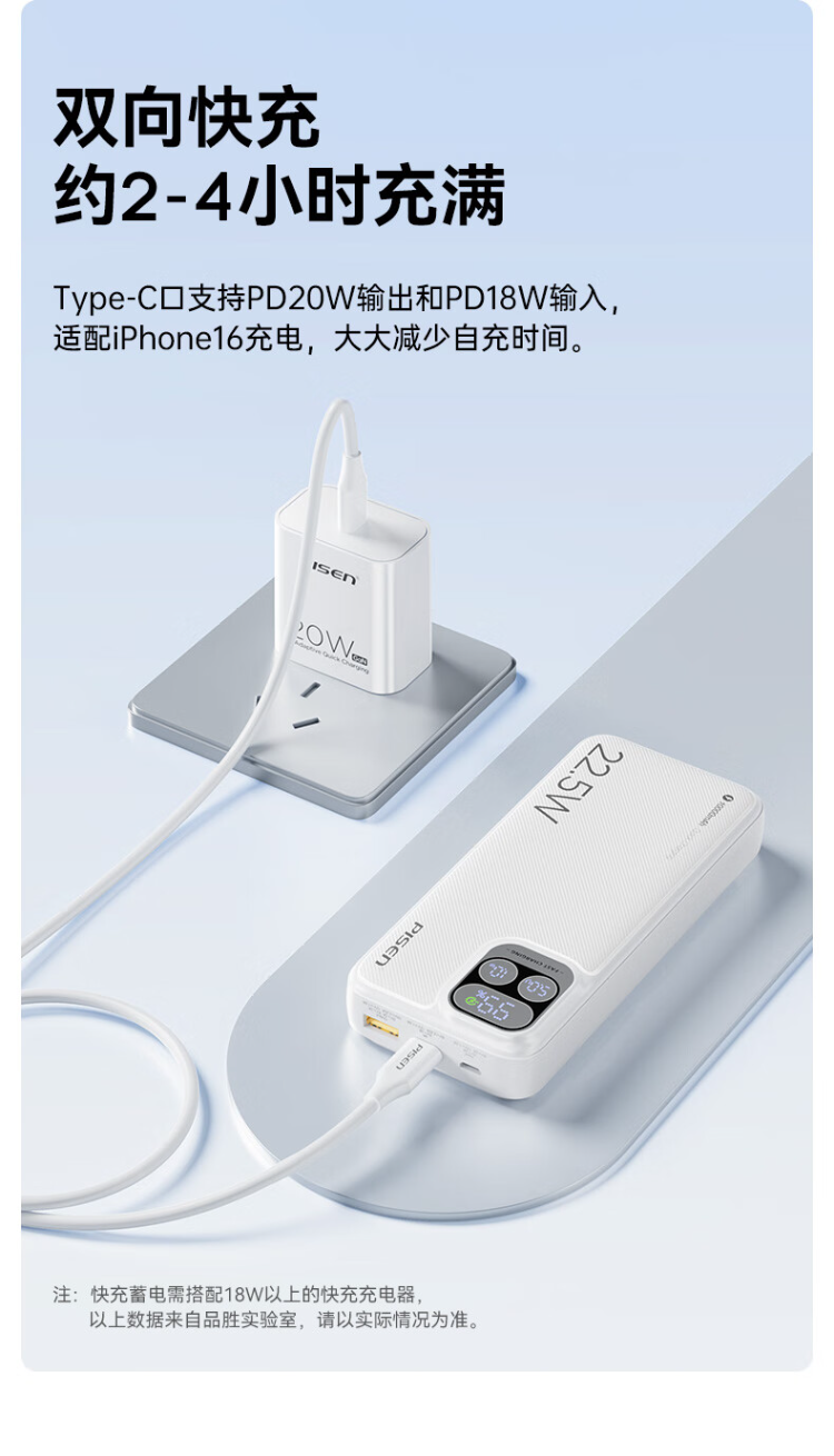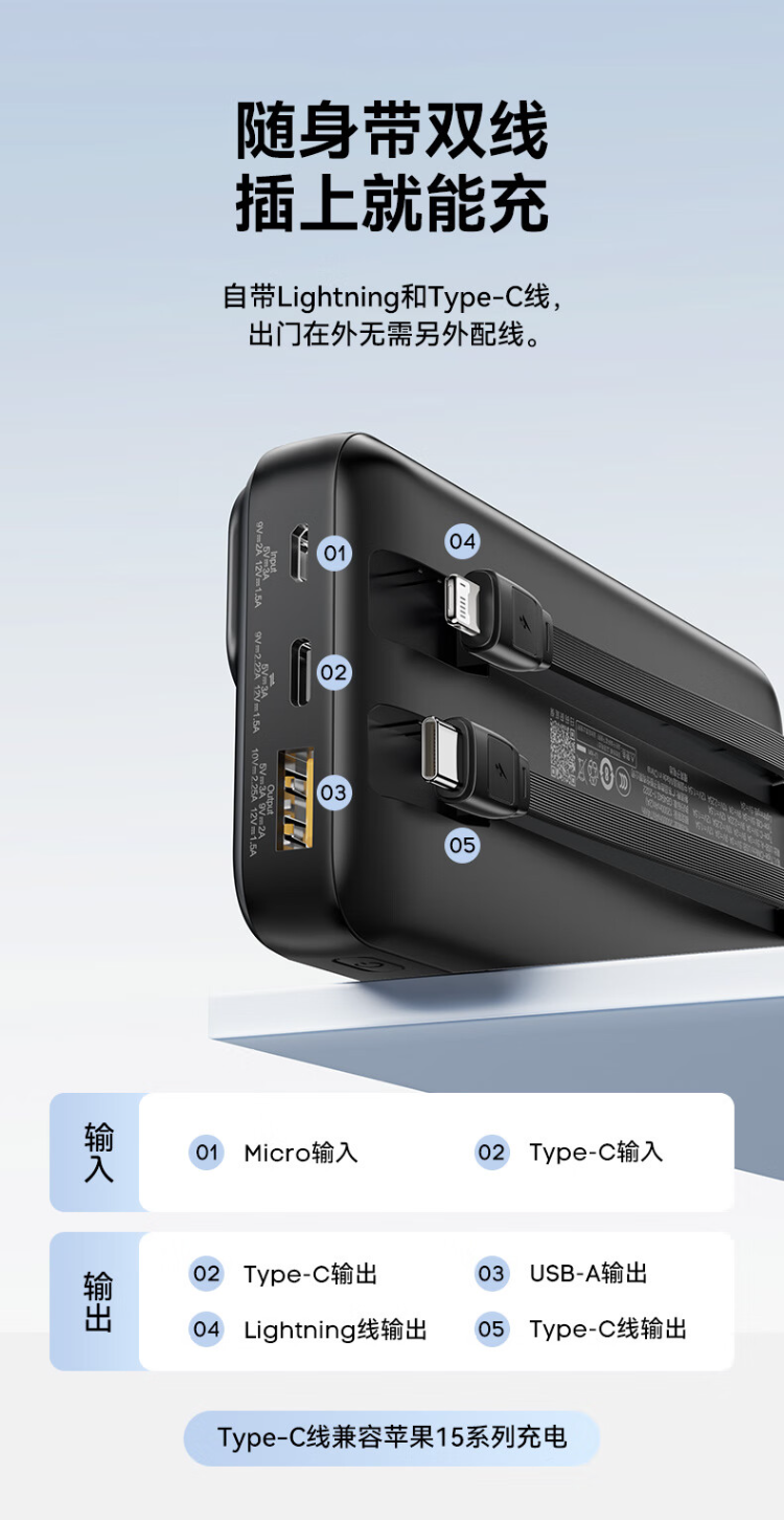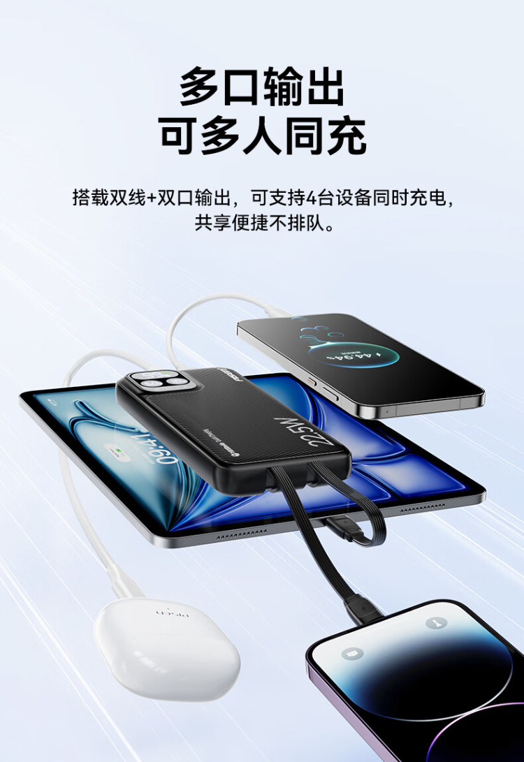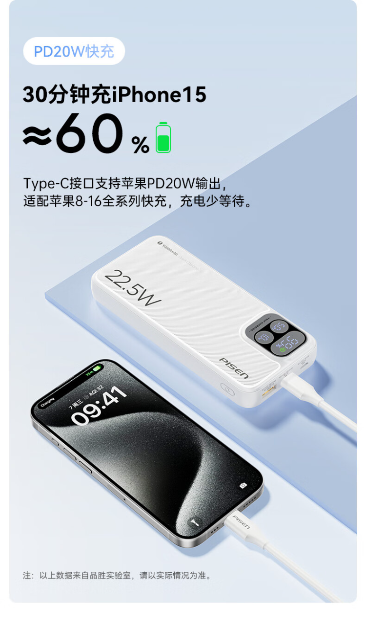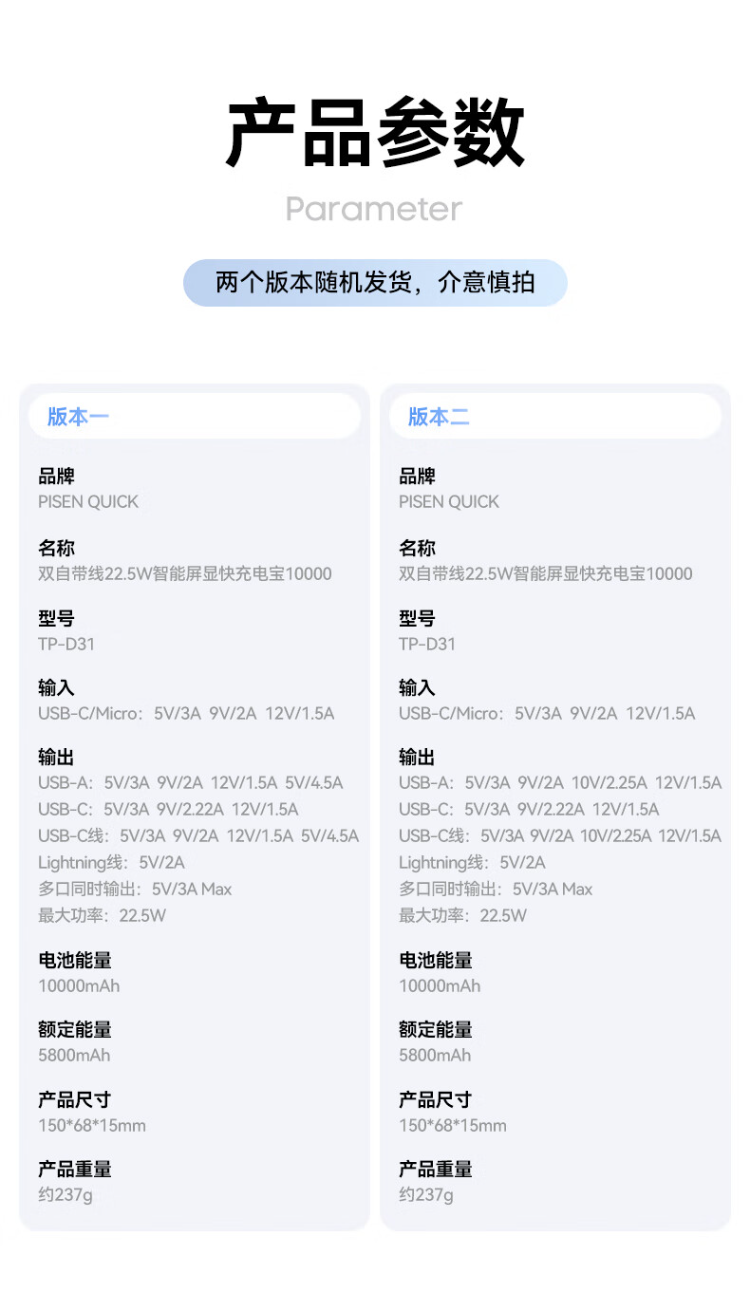 TP-D31黑 品胜充电宝自带线10000毫安大容量22.5W超级快充轻薄便携移动电源
