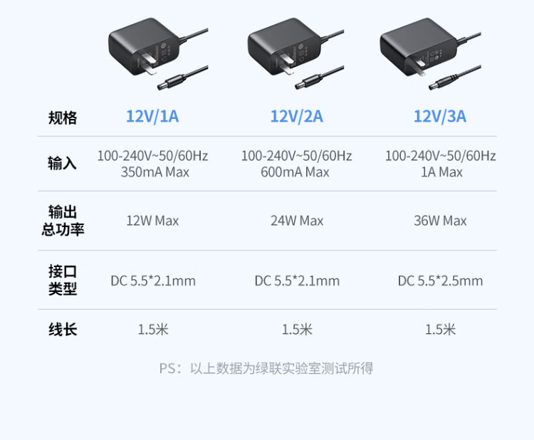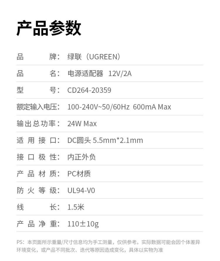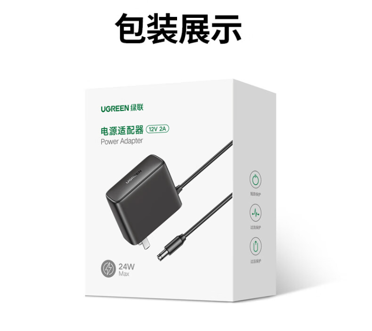 绿联12V/2A电源适配器通用显示器硬盘盒路由器电脑充电线1.5米CD264-20359
